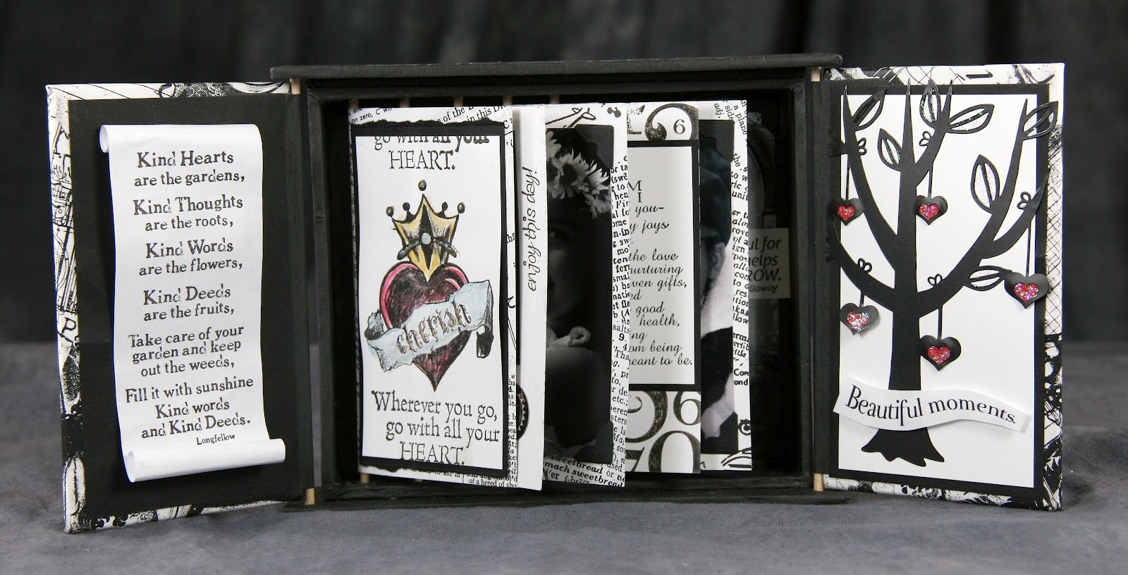 The inside holds pictures and rubber stamped quotes on five inserted pages that are attached to rotating wooden dowels.